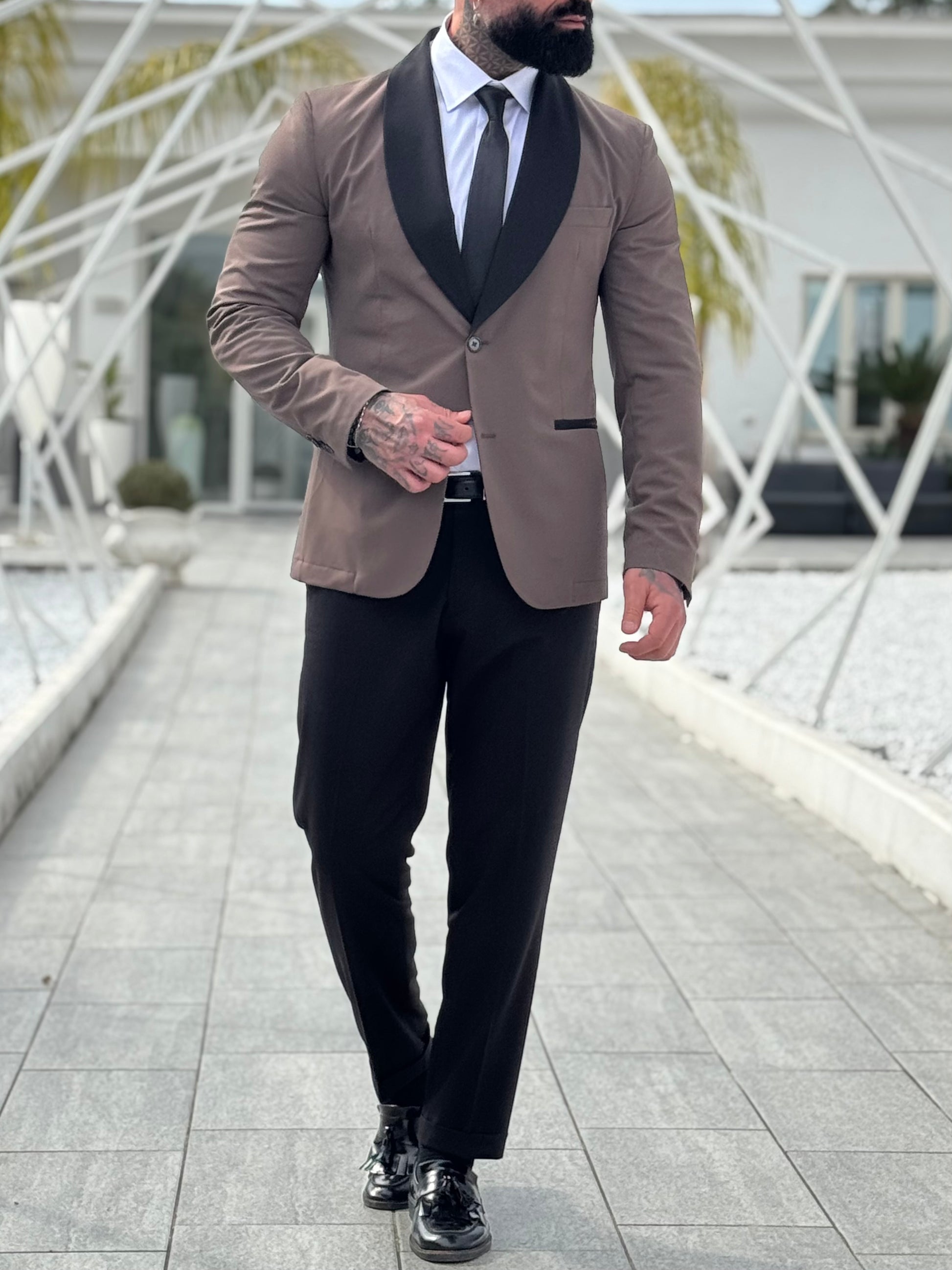 Eleganza intramontabile e carattere deciso definiscono questo blazer smoking marrone con rever nero a contrasto. Un capo raffinato che unisce la tradizione del tuxedo alla modernità delle linee slim, perfetto per le occasioni più importanti.