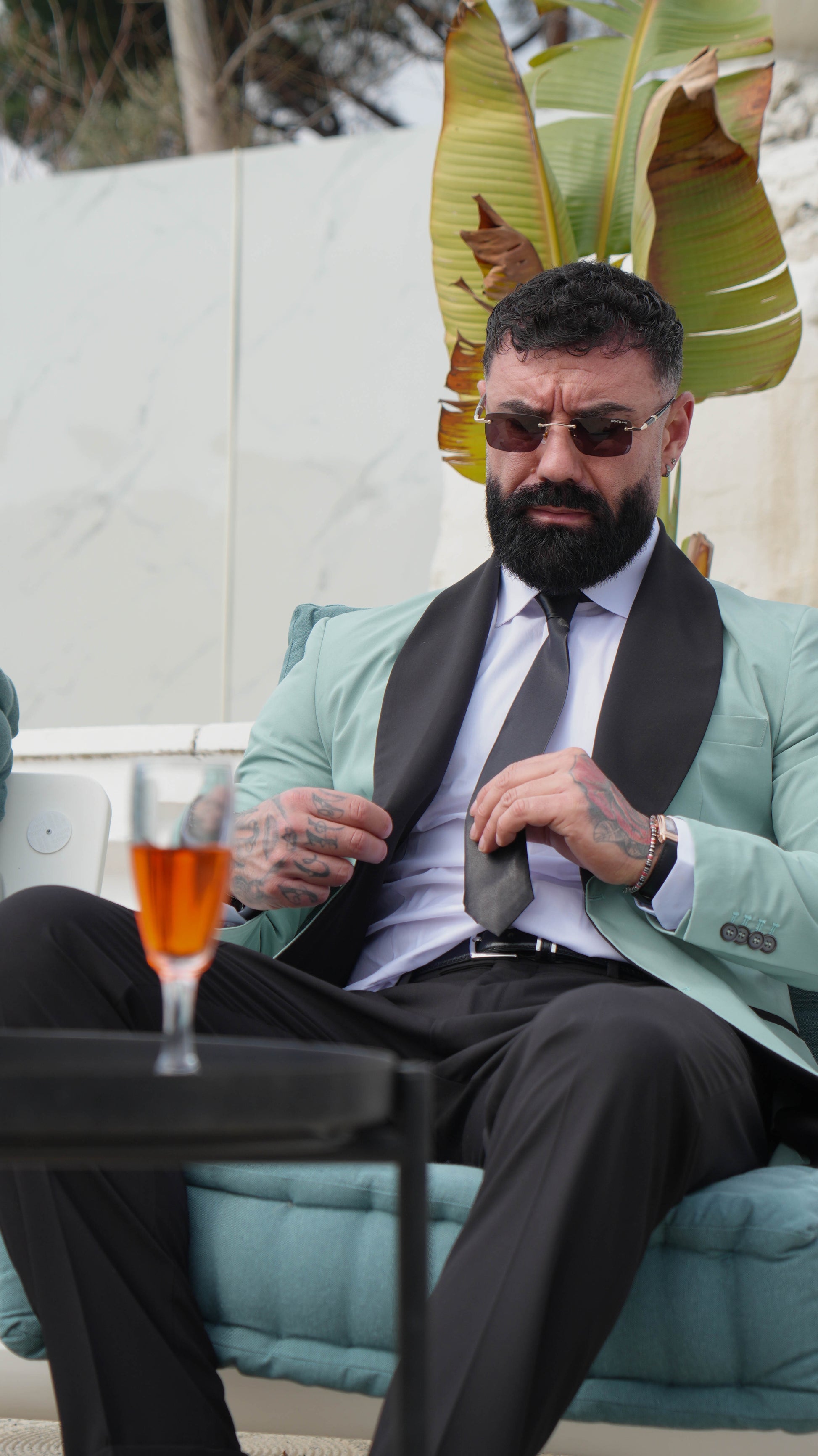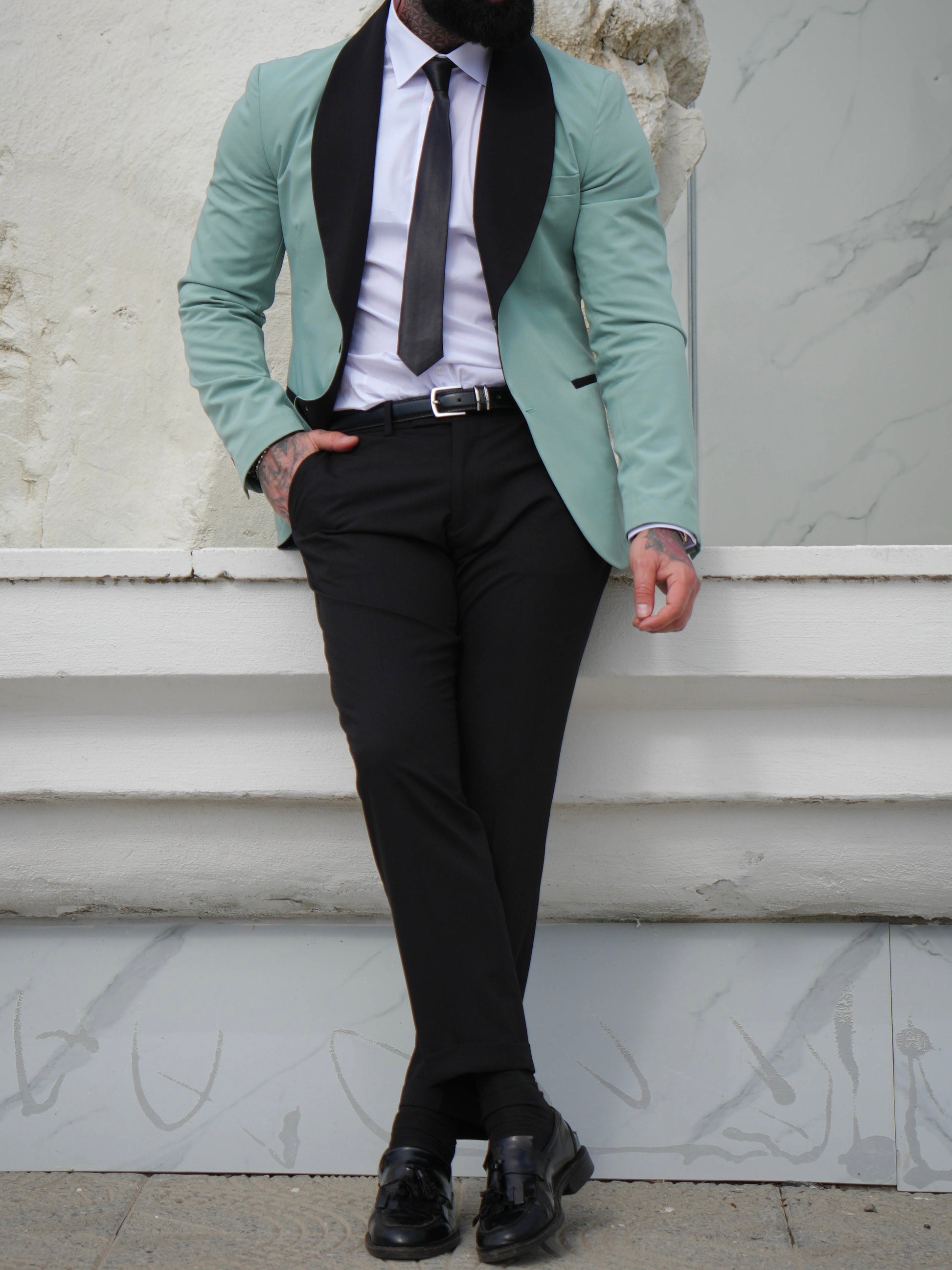 Raffinato, moderno e distintivo. Questo blazer smoking verde salvia con rever nero a contrasto è la scelta ideale per chi desidera un look elegante ma fuori dagli schemi. Una reinterpretazione contemporanea del classico tuxedo, perfetta per eventi esclusivi e cerimonie.
